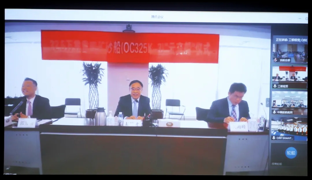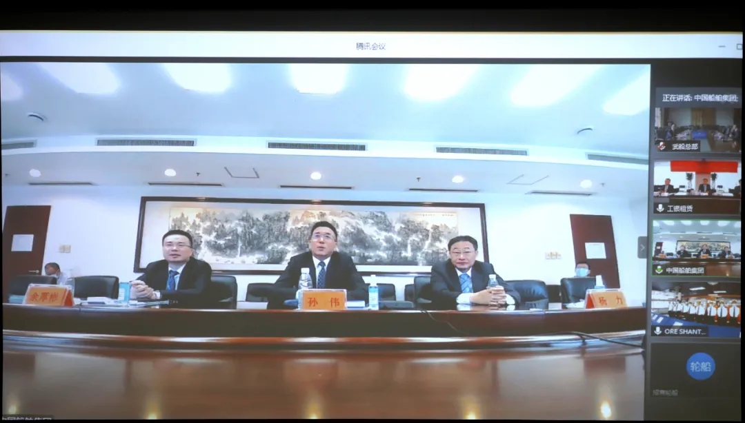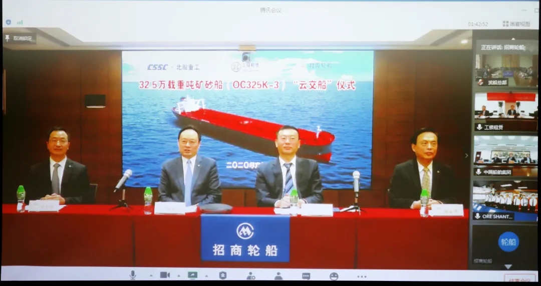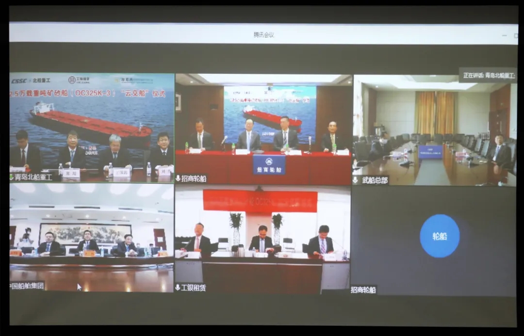 本次“云交船”儀式在北京、香港、武漢、青島4城5地同步舉辦,中國船舶集團副總經(jīng)理孫偉、招商輪船董事長謝春林、工銀租賃總裁趙桂才、武船集團董事長陳?較群籩麓牽?工銀租賃航運金融事業(yè)部執(zhí)行總經(jīng)理郭芳萌、武船集團北船重工總經(jīng)理谷克超代表雙方簽署了交船議定書,武船集團北船重工董事長王國海主持儀式。