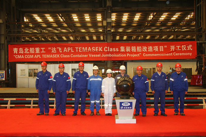 4月2日下午15點(diǎn)58分,武船集團(tuán)北船重工“達(dá)飛公司系列集裝箱船升級(jí)改造項(xiàng)目”開(kāi)工儀式在北船重工造船聯(lián)合廠房順利舉行。法國(guó)達(dá)飛輪船公司改裝項(xiàng)目現(xiàn)場(chǎng)經(jīng)理MR.JAN IVERSEN,DNV-GL船級(jí)社高級(jí)驗(yàn)船師包青波,北船重工副總經(jīng)理于寶月、劉玉東及總經(jīng)理助理丁福增,北船重工造船相關(guān)部門和修船分廠的領(lǐng)導(dǎo)出席了儀式。