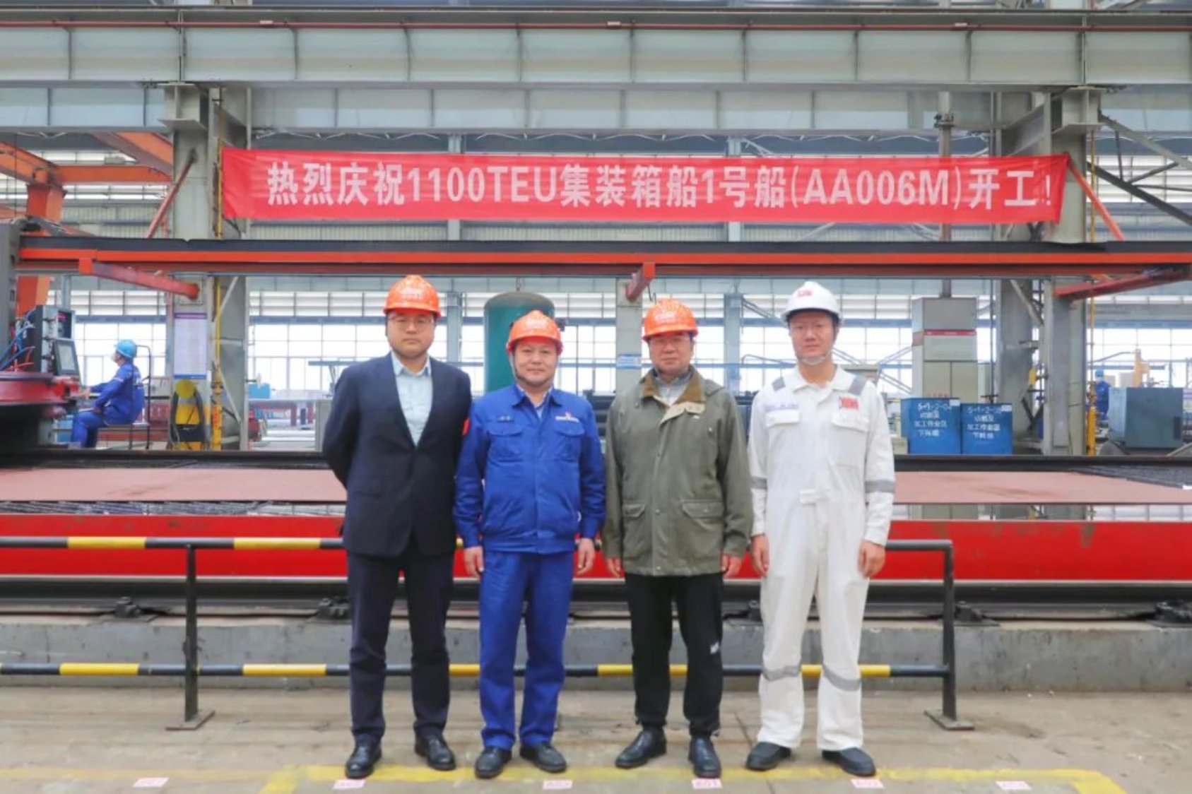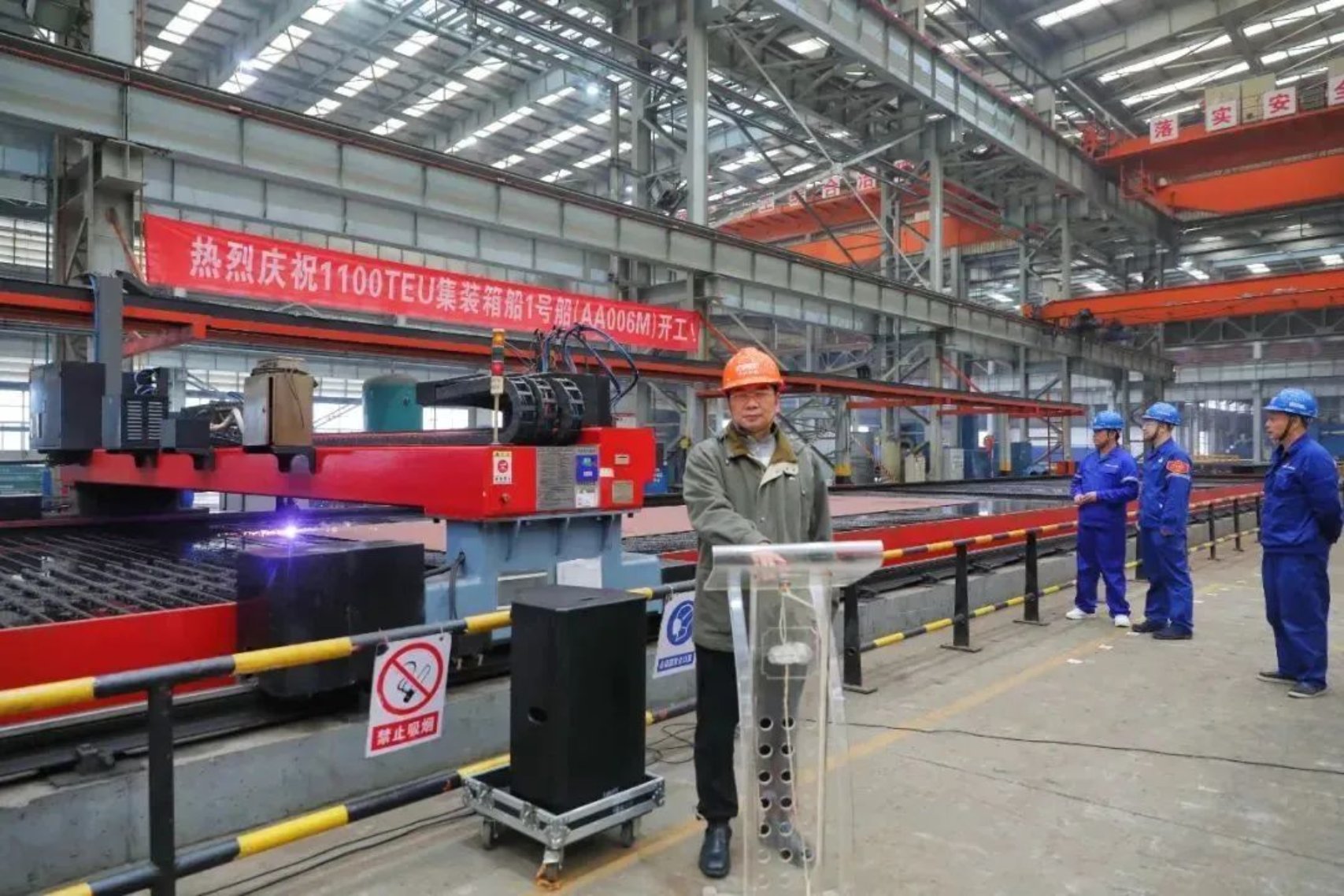 11月18日上午11時18分,中國船舶武船為CA Shipping建造的1100TEU集裝箱1#船項目在武船雙柳總部順利開工。