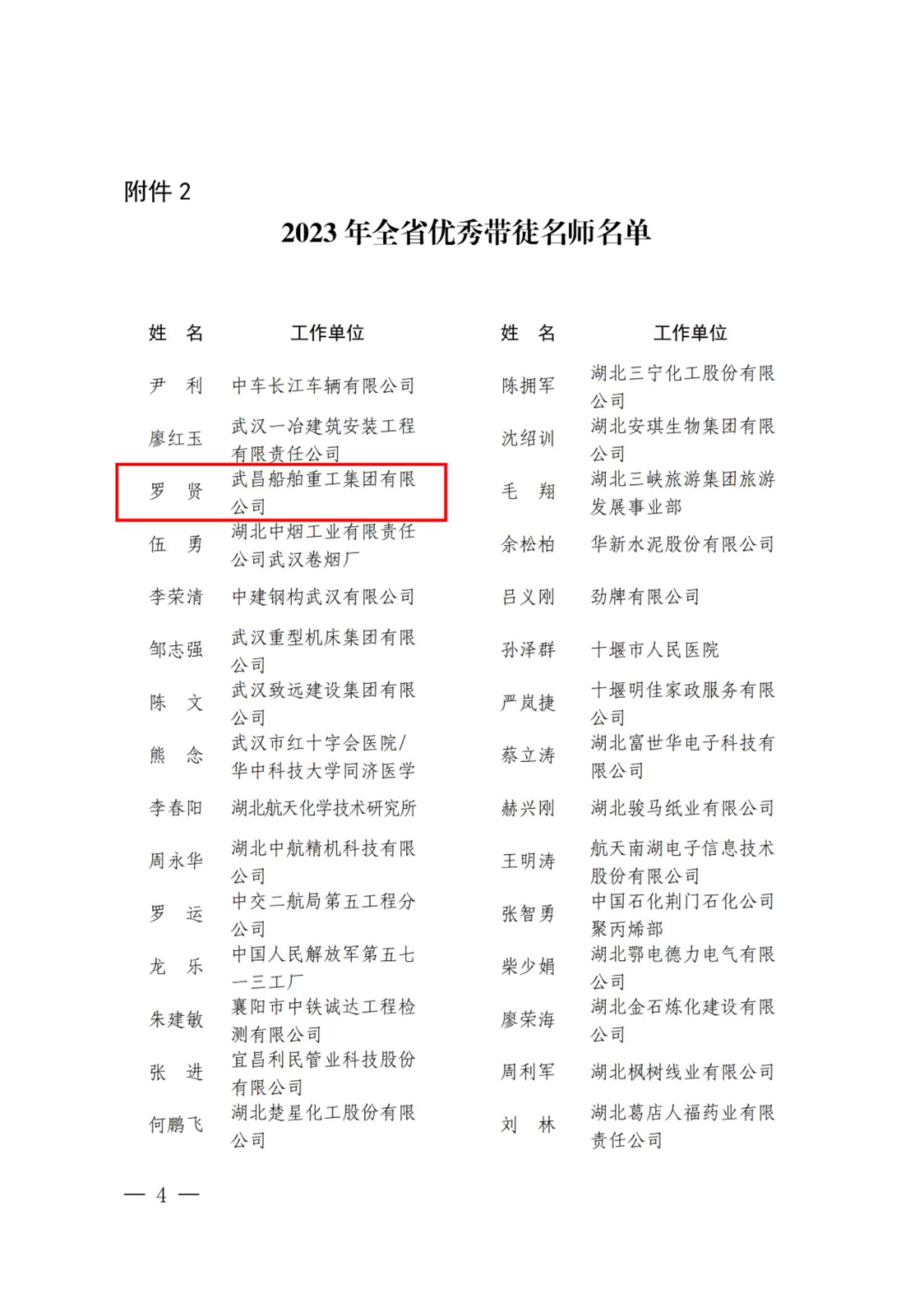 湖北省優秀帶徒名師羅賢,積極履行技能帶頭人崗位職責,參與武昌造船的焊工技能培訓,并將施焊經驗毫無保留地傳授給徒弟。他常常說:一枝獨秀不為貴,百花齊放才是春。多年來經過羅賢傳幫帶訓的焊接技能人才已經超過200人。他根據在制產品特點完成關鍵工序課程的開發和編制,對焊工進行理論、實操技能提升培訓,為國防裝備建設培養出一批高素質、高水平的優秀生產骨干。
