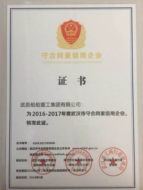 喜報 | 武船集團榮獲2016- 2017年度武漢市“守合同重信用企業”證書