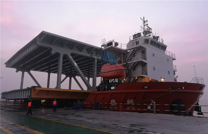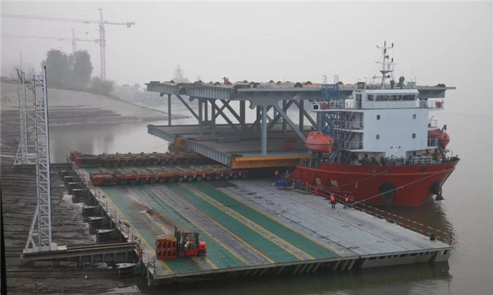 斜船架經(jīng)過45分鐘的下行,滑行到達(dá)指定水域,等待的運(yùn)輸船舶盛暢7#迅速起錨靠近斜船架,固定纜繩、對準(zhǔn)搭接通道、左舷壓水,項(xiàng)目部、起重運(yùn)輸部和雙柳公司等20余人的發(fā)運(yùn)團(tuán)隊(duì)各就各位,各司其職,一系列的準(zhǔn)備工作嫻熟而利落。隨后操作人員啟動(dòng)模塊車,在指揮人員的指令中,緩緩上船。3排軸線上船后,船右舷傾斜下沉,對講機(jī)中不斷傳來操作指令:斜船架1檔下行、停止、左舷繼續(xù)壓水、模塊車低速前進(jìn)……,模塊車前輪越過中線后,船體逐漸向左舷復(fù)位傾斜,對講機(jī)中操作指令又不斷清晰傳來:斜船架上拉、左舷壓水停止、模塊車?yán)^續(xù)前進(jìn)……。