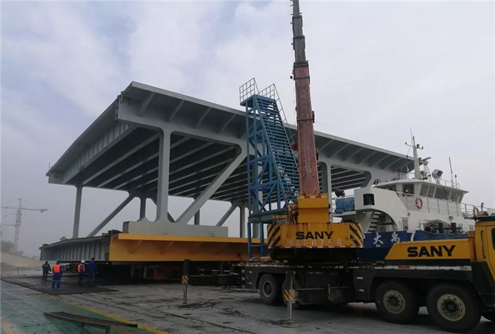經(jīng)過約1小時(shí)的緊張運(yùn)行,梁段中線與船體中線重合,模塊車停止前進(jìn),微微對位調(diào)整后,早上6時(shí)58分,模塊車落墩就位。綁扎牢固后,盛暢7#解纜離岸,開足馬力,駛向楊泗港橋址。
