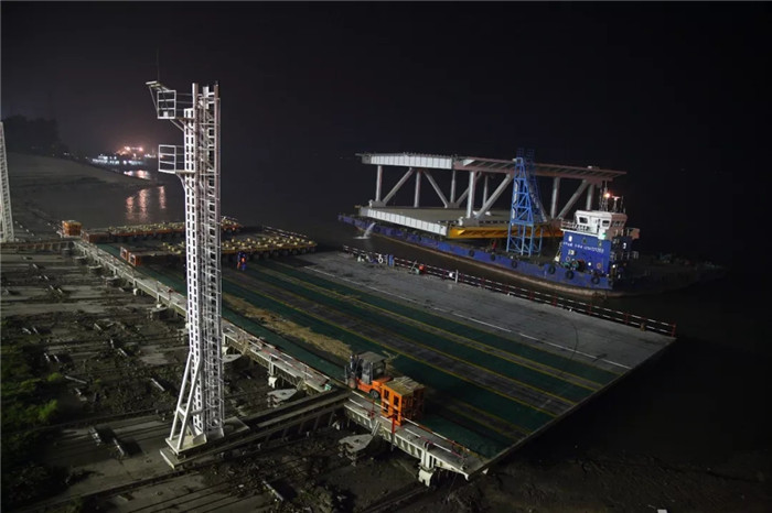 第22節(jié)G8H和第23節(jié)G9H分段接連裝船,分別裝上滬大禹7號和大禹傳奇兩艘運(yùn)輸船舶。待大禹傳奇載著G9H分段離岸駛開時(shí),夜幕再一次地來臨,時(shí)間指向21時(shí)。