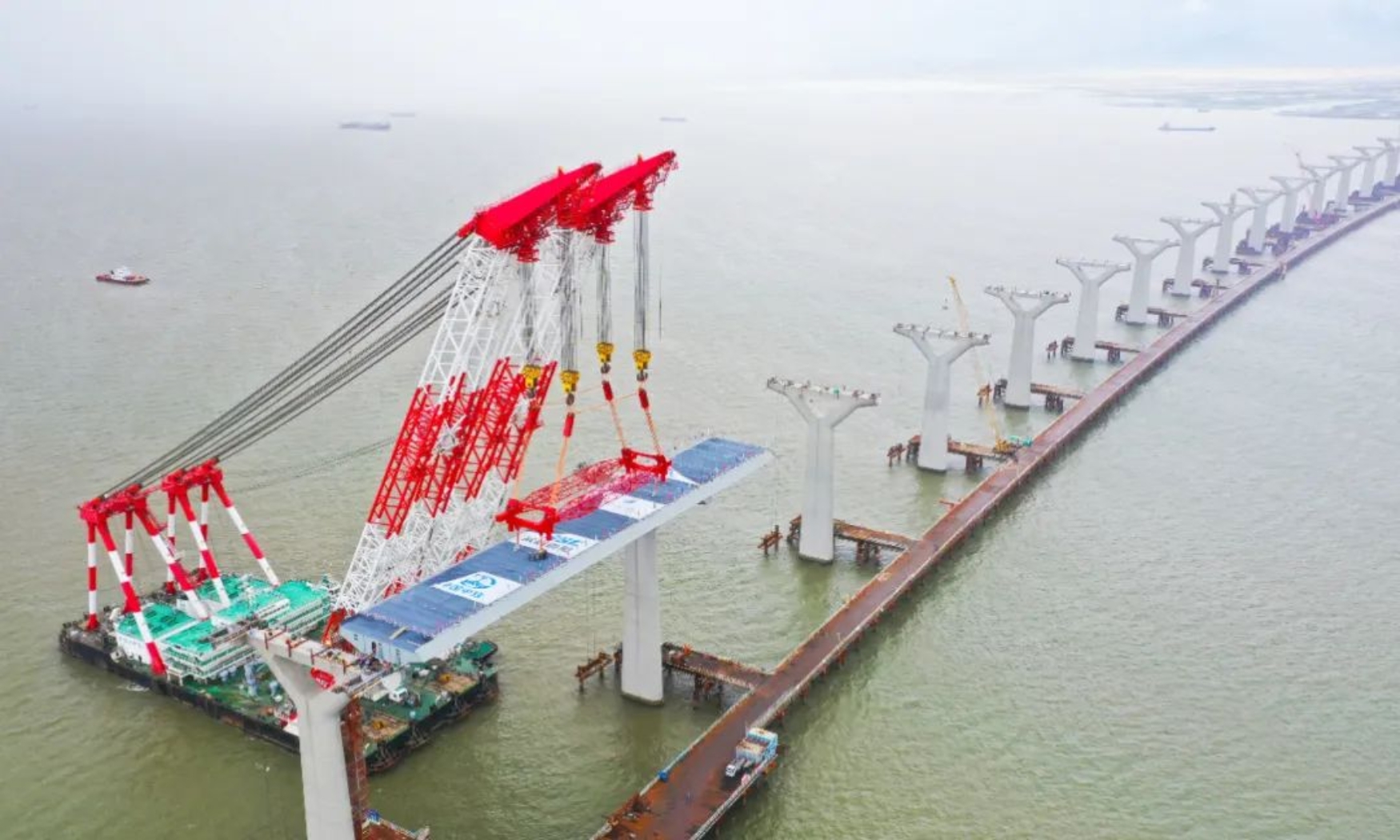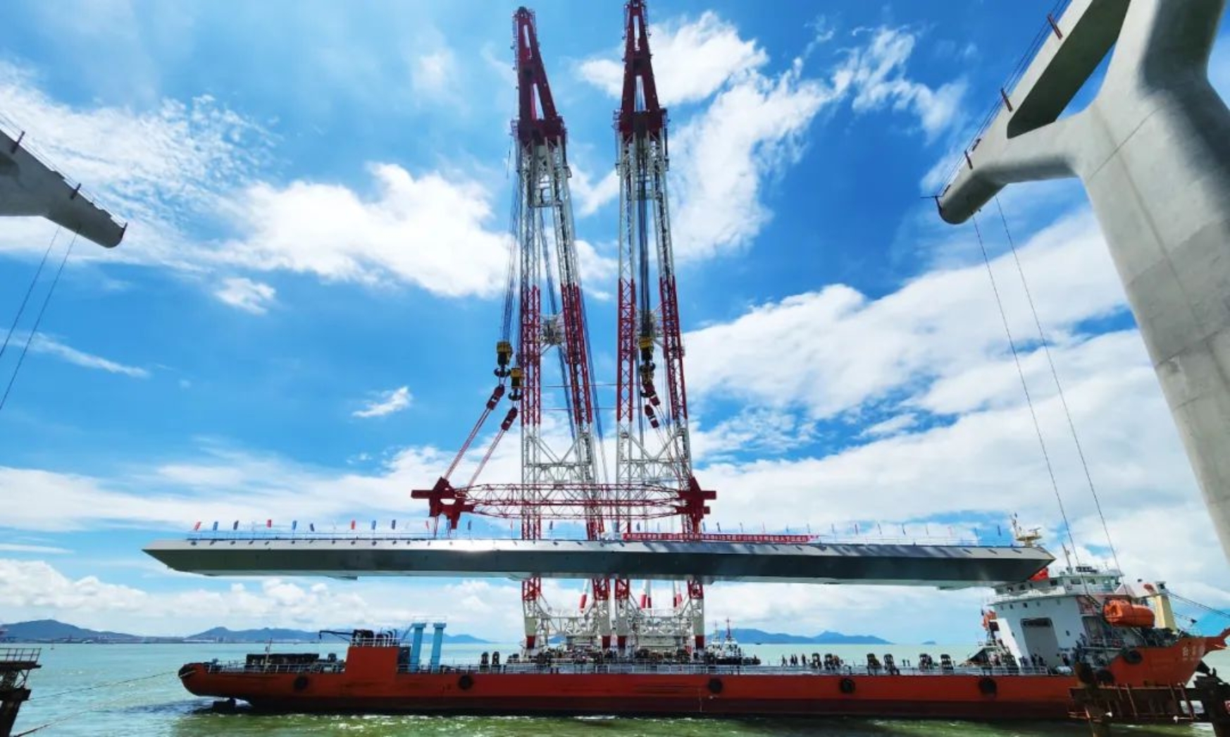 8月12日下午14時(shí),黃茅海跨海通道中引橋施工現(xiàn)場(chǎng),重達(dá)1340噸鋼箱梁大節(jié)段成功吊裝,標(biāo)志著黃茅??绾Mǖ乐幸龢蜾撓淞捍蠊?jié)段吊裝作業(yè)全面開始。
