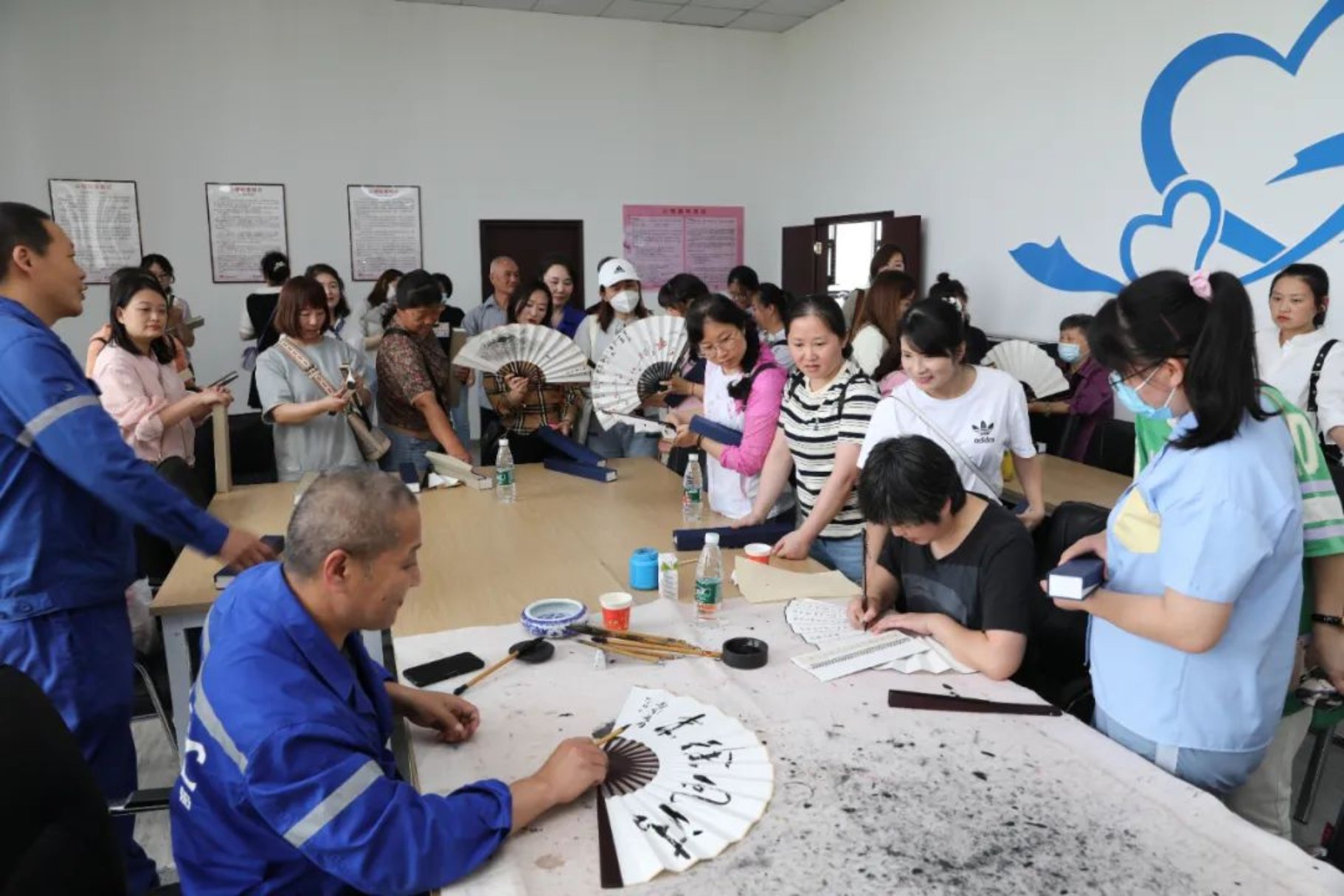 職工家屬參觀職工活動中心,武昌造船書法協會會員現場創作字畫折扇并贈送職工家屬