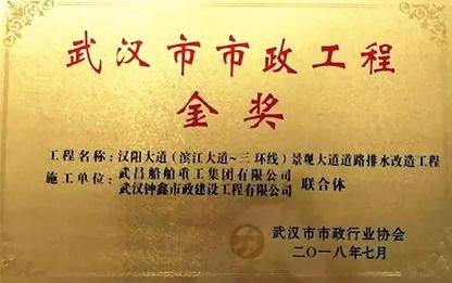 2018年8月,武漢市市政工程金獎評選工作如期開展,武船集團交通研究院參與建設的漢陽大道(濱江大道~三環線)景觀大道工程被評為武漢市市政工程金獎。
