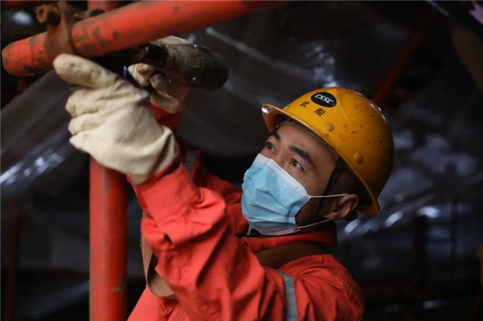 ▲21:30,某產品機艙里,年輕管工師傅艱難地爬進狹縫里,準備焊接管件