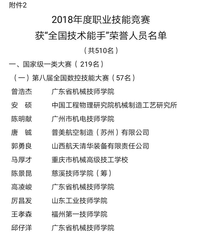 日前,人社部決定授予在第45屆世界技能大賽全國(guó)選拔賽和在2018年中國(guó)技能大賽中取得優(yōu)異成績(jī)的選手“全國(guó)技術(shù)能手”榮譽(yù),并頒發(fā)獎(jiǎng)?wù)隆ⅹ?jiǎng)牌和榮譽(yù)證書。