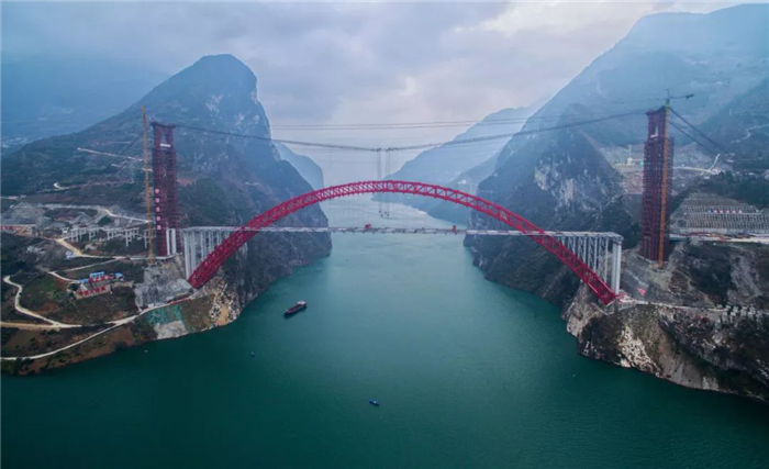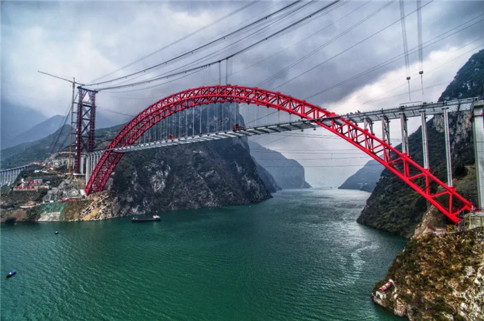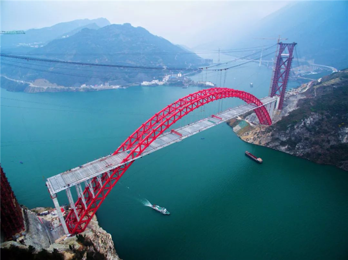 香溪長江公路大橋位于湖北宜昌秭歸兵書寶劍峽峽口,橋梁主跨531.2米,橋面寬32.3米,是目前世界最大跨度的鋼箱桁架推力拱橋,大橋在今年5月22日實(shí)現(xiàn)了主拱合龍,8月30日拱上立柱吊裝完成,隨后開始架設(shè)鋼主梁,主梁架設(shè)歷時(shí)約4個(gè)月。本次合龍段施工包括2根主縱梁、7根中縱梁、8根橫梁、2塊人行道板施工。