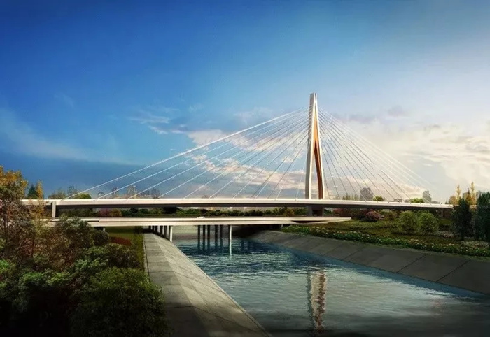 該項目位于鄭州市四環(huán)線西部(大河路-南四環(huán)),規(guī)劃為快速路,全長21.6km,高架橋為雙向八車道。項目南起西四環(huán)光明路口向南300m,北至西四環(huán)晨星路口向北160m,全長5.95km。橋梁總長300m,橋面總寬49.16m,主橋屬獨塔雙索面斜拉橋,采用梁高3.5m鋼箱梁結構形式。