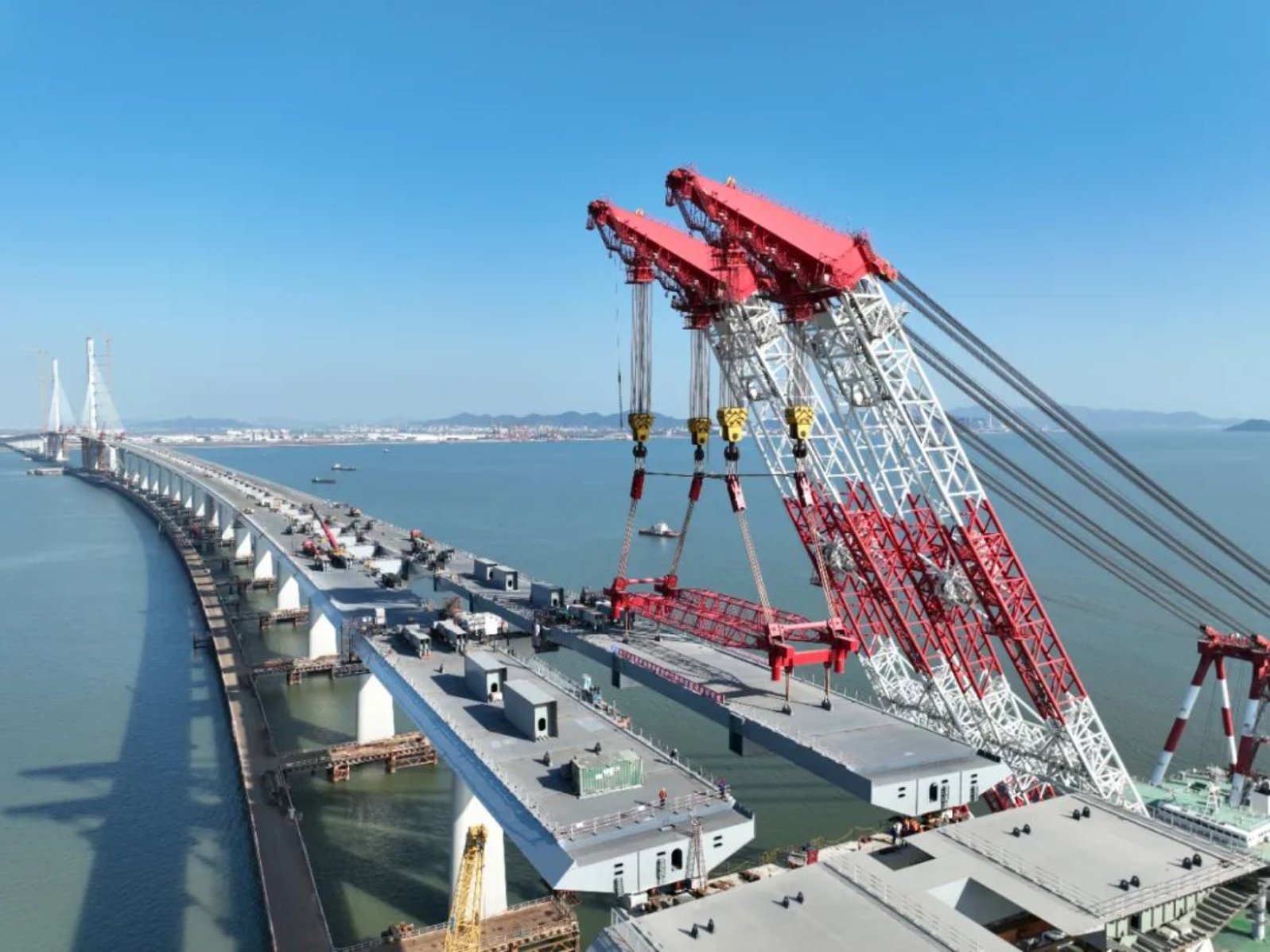 1月15日,伴隨著3-5Z鋼箱梁大節(jié)段成功吊裝,中國船舶集團(tuán)武昌造船重工公司承建的黃茅海跨海通道G2合同段中引橋順利合龍,在黃茅海跨海通道項(xiàng)目3個鋼結(jié)構(gòu)工程中率先實(shí)現(xiàn)合同段主體工程完工!