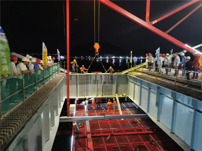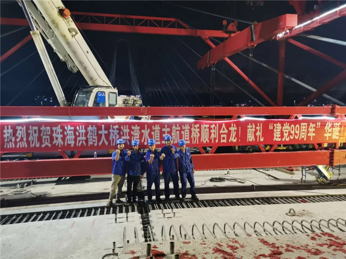 7月1日凌晨,隨著中跨合龍段主縱梁安裝完成,中國船舶武船集團武船重工股份承建的珠海洪鶴大橋洪灣水道主航道橋按期實現(xiàn)高精度合龍,獻禮中國共產(chǎn)黨建黨99周年。