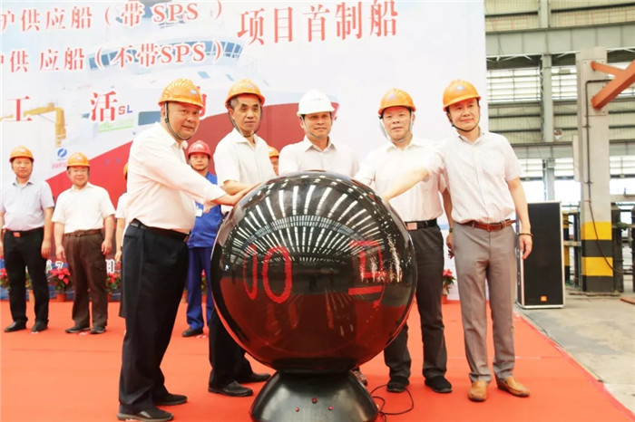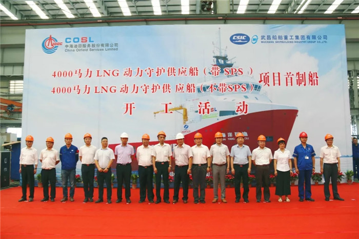 2019年7月30日上午10點(diǎn)08分,中海油服兩型八艘4000馬力LNG動力守護(hù)供應(yīng)船首制船開工儀式在武船集團(tuán)船舶公司六連跨內(nèi)業(yè)車間舉行。中海油田服務(wù)股份有限公司船舶事業(yè)部副總經(jīng)理蔡鈿,中國船級社武漢分社副總經(jīng)理余德斌,上海佳豪船海工程研究設(shè)計有限公司院長秦炳軍,武船集團(tuán)經(jīng)濟(jì)運(yùn)行部、質(zhì)量部、安保部、規(guī)劃部、船海設(shè)計公司及船舶公司相關(guān)單位領(lǐng)導(dǎo)參加了此次活動。